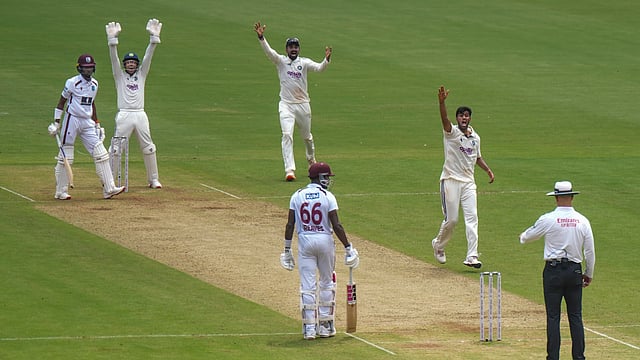 Siraj produced the ball of the innings after lunch when he angled one into the right-handed Chase (24), who was squared up and an outside edge was collected by the wicketkeeper Dhruv Jurel.