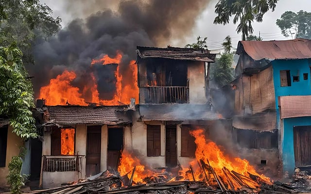 "Around 12 dwelling houses were set on fire at Ranirbazar by miscreants late on Sunday after an idol of Goddess Kali was found disfigured in Kaiturbari. A few motorcycles and pick-up vans were also gutted in the blaze," Assistant Inspector General (Law and Order) Ananta Das told.