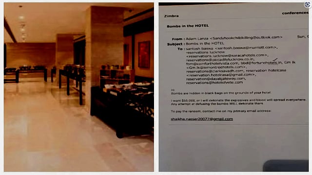 At least 10 major hotels in the Uttar Pradesh capital received bomb threats via email on Sunday. The email threatened that explosions would take place if a ransom demand of USD 55,000 (Rs 4,624,288) is not met. "Bombs are hidden in black bags on the grounds of your hotel. I want USD 55,000, or I will detonate the explosives and blood will spill everywhere. Any attempt at defusing the bombs will detonate them," read the threat email, a copy of which is with PTI.
