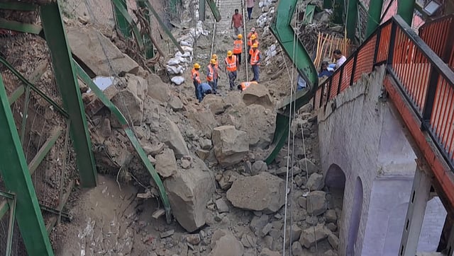 A landslide struck the Mansa Devi hills near the Har Ki Pauri here on Monday, obstructing the Haridwar-Dehradun rail route, an official said. Boulders from the Mansa Devi hill fell on the railway track in Bhimgoda near Kali temple blocking the Haridwar-Dehradun Rishikesh railway route, Government Railway Police (GRP) Superintendent of Police Aruna Bharti said. The railway track near Bhimgoda railway tunnel was completely closed due to the debris affecting movement of more than a dozen trains, including the Vande Bharat Express, she said. A Shiva temple built near the railway track also collapsed under the impact of the landslide, Circle Officer Swapnil Suyal said. The Mansa Devi hills are cracking once again due to heavy rains in Haridwar. The railway track was obstructed due to a landslide from the hill at the same place a few days ago. A huge iron net has been installed between the hill and the railway track. But despite this, big pieces of stones broke the net and fell on the track. The railway team has reached the spot and the work of removing debris from the track has been started. Movement of trains on the route, including the Vande Bharat Express, has been suspended for the time being as the debris clearance is likely to take 8-10 hours, the official said. The damaged net is being cut with the help of gas cutter and stones are being removed from the track with the help of JCB.