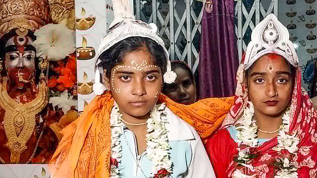 In a quiet hamlet deep inside Sundarbans, where mangrove forests guard a maze of rivers and traditions run long and deep, two young women stood before a village temple and chose each other for life. Professional dancers Riya Sardar and Rakhi Naskar, both in their early twenties, tied the knot at the Paler Chak temple in Jalaberia in Kultali block, on November 4 in a ceremony that drew hundreds of villagers who ululated, blew conch shells and blessed the couple. In a country where same sex marriages have no legal sanction and the issue still pending before the Supreme Court, the wedding was a quiet rebellion rooted more in affection than activism. It unfolded in a socially conservative part of the Sundarbans, where such public assertions are unusual. Yet on that afternoon, the temple courtyard shimmered with colour and curiosity as Riya, dressed as the bride, and Rakhi, wearing a groom's crown, exchanged garlands (mala badal) and took sacred vows. A priest conducted all rituals.