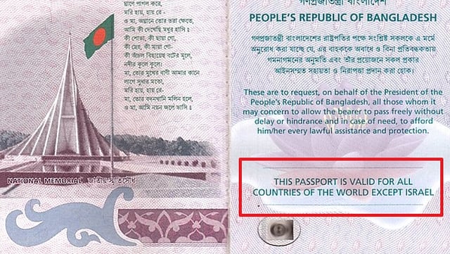 Bangladesh has reintroduced "except Israel” inscription on passports debarring its citizens from travelling to the Jewish state as public anger mounted against Israeli attacks on the Gaza Strip, officials said on Sunday. The home ministry issued a directive asking the passport and immigration department to reinstate the sentence “THIS PASSPORT IS VALID FOR ALL COUNTRIES OF THE WORLD EXCEPT ISRAEL” in the official travel permits for citizens visiting abroad, the state-run BSS news agency reported. The phrase "all countries except Israel" was dropped in 2021 during the Awami League government led by now-deposed prime minister Sheikh Hasina. The authorities at that time said it was dropped from the passport to maintain international standards of the document. “We issued the letter (directive) on April 7,” Nilima Afroze, Deputy Secretary of Home Ministry’s Security Services Division, told the news agency. The disclosure, however, came a day after thousands of protesters rallied in the capital to condemn Israeli actions in the Gaza Strip, carrying hundreds of Palestinian flags and chanting slogans like “Free, Free Palestine.” The main protest was held in central Dhaka’s Suhrawardy Udyan near the premier Dhaka University and many among them beat the images of US President Donald Trump and Israeli Prime Minister Benjamin Netanyahu, accusing them of backing Israel. Former prime minister Khaleda Zia’s Bangladesh Nationalist Party and rightwing Islamic groups and parties expressed solidarity with the rally.