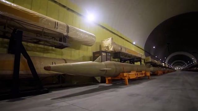 Iran's military said on Thursday that it holds a large stock of suicide drone boats now being deployed to restrict passage through the Strait of Hormuz. State television released footage said to have been filmed inside an underground complex the authorities describe as a "missile city". The images show long tunnels lined with naval drones, anti-ship missiles and sea mines. Additional footage depict some of the weapons being launched. It remains unclear when the recordings were made and whether the site has since been struck by American or Israeli forces. One still image from the material shows a tunnel containing a naval drone mounted on a trailer beneath a portrait of Supreme Leader Ayatollah Ali Khamenei.