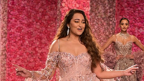 Sonakshi walked down the ramp in a light pink high-slit corset gown with floral net sleeves and a long train. She opted for a curly hairstyle and kept the accessories to a minimum with a pair of earrings and a few rings to complement the garment.