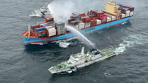 MV Maersk Frankfurt, carrying 1,154 containers, including some with dangerous cargo like benzene and sodium cyanate, had caught fire some 102 nautical miles off the coast of Goa while on its way from Mundra in Gujarat to Colombo in Sri Lanka. One crew member died in the blaze, a Coast Guard official had said on Sunday.
